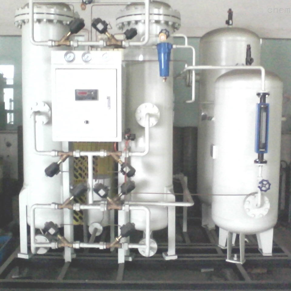 PSA制氧机主要由空气压缩机、活性炭过滤器、空气冷干机、空气缓冲罐、制氧主机、氧气压缩机等组成。原料空气经吸入口过滤器除掉灰尘颗粒后,被空气压缩机增压至0.5Mpa,首先由活性炭过滤器除空压机刚开机时压缩空气夹带的少量油份,再经空气冷干机冷凝除水,而进入制氧主机的一只吸附器内。吸附器内装填吸附剂,其中水分、二氧化碳及少量其它气体组分在吸附器入口处被装填于底部的活性氧化铝所吸附,随后氮气被装填于活性氧化铝上部的分子筛所吸附。而氧气为非吸附组分从吸附器顶部出口处作为产品气排至氧气平衡罐,经氧气压缩机增至所需的用氧压力,送入至后续用氧工段使用。