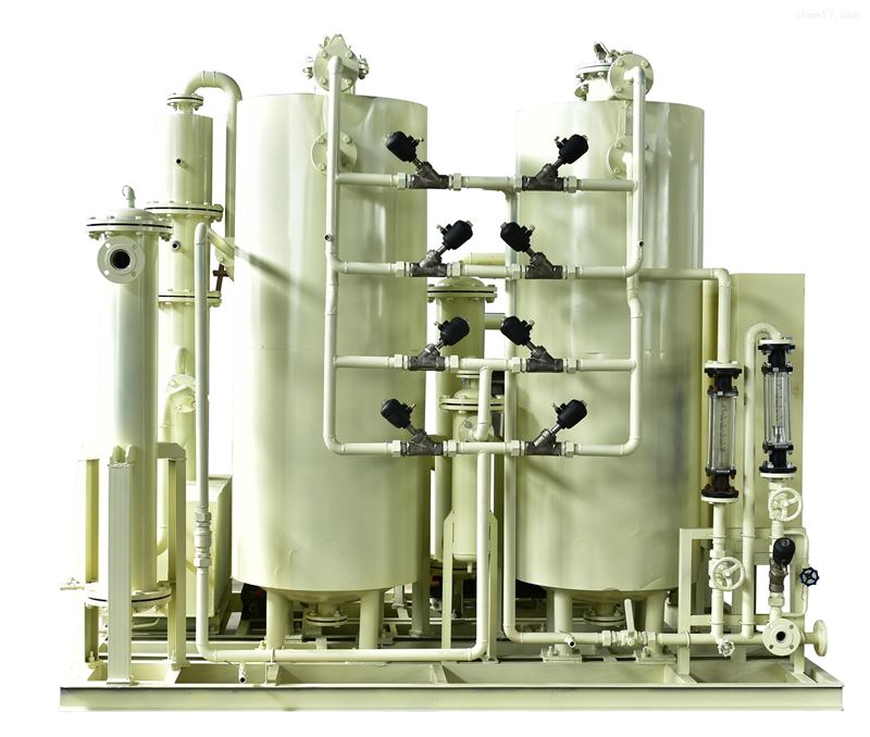变压吸附制氮是以洁净、干燥的压缩空气为原料,利用一种高选择性的固体吸附剂(碳分子筛)对氮和氧的选择性吸附的性能把空气中的氮和氧分离出来。碳分子筛是非极性分子,优先吸附氧。碳分子筛对氧和氮的分离作用主要是基于这两种气体在碳分子筛表面的扩散速率不同,较小直径的气体(氧气)扩散较快,较多进入分子筛固相,较大直径的气体(氮气)扩散较慢,较少进入分子筛固相。这样气相中就可以得到氮的富集成分。变压吸附法通常使用两塔并联,交替进行加压吸附和解压再生,从而获得连续得氮气流。