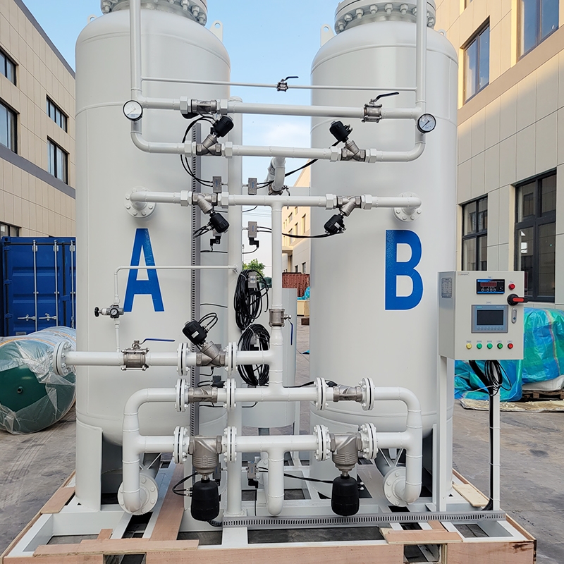 PSA碳分子筛制氮装置中有两个装满碳分子筛的吸附塔,洁净、干燥的压缩空气进入变压吸附制氮装置,流经装填有碳分子筛(CMS)的吸附塔。